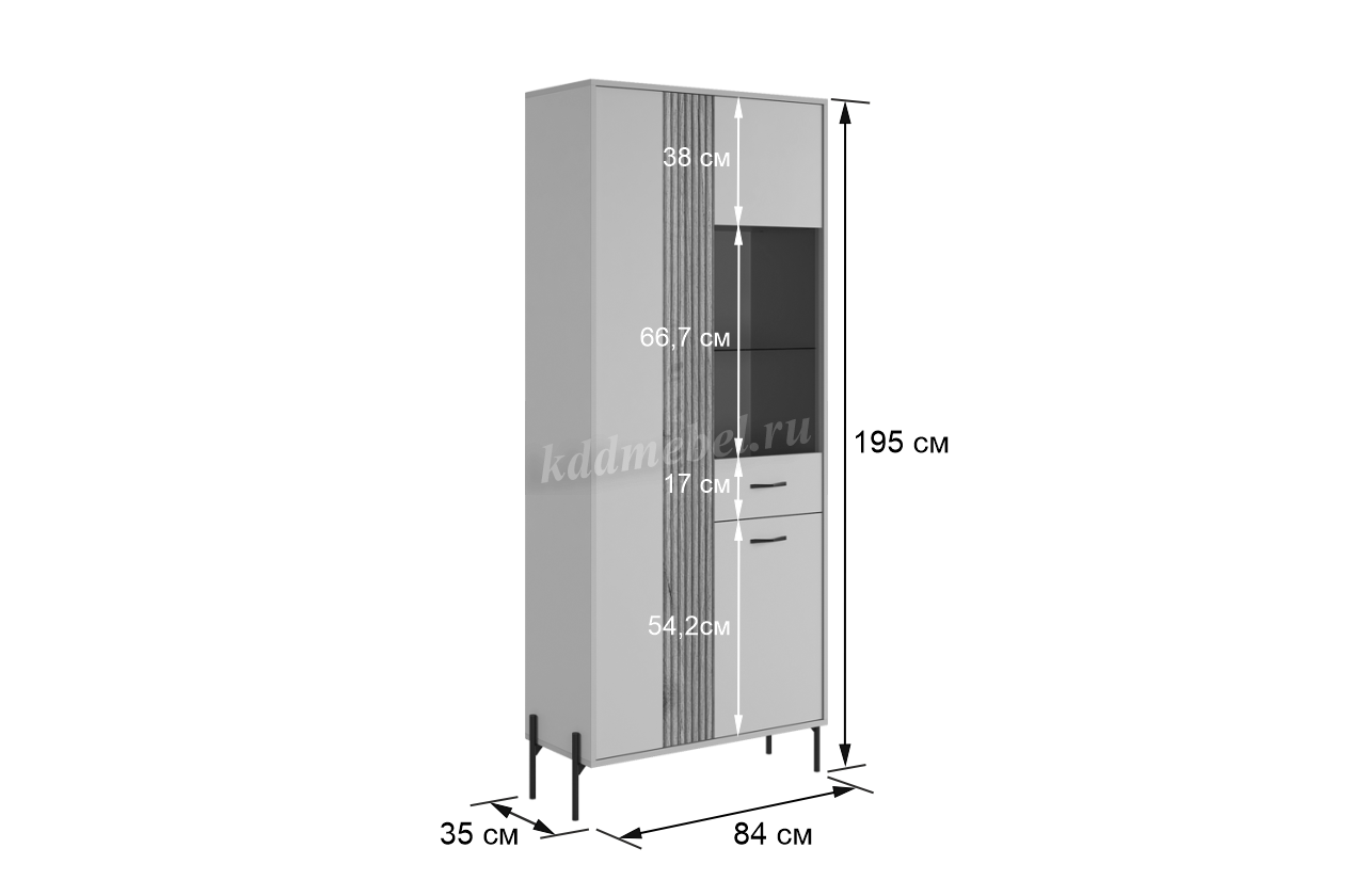 Шкаф оснащен одним большим глухим фасадом, скрывающим за собой четыре закрытые полки. Это обеспечивает достаточно пространства для хранения одежды, книг, посуды или других предметов, которые вы предпочитаете держать вне поля зрения. Фасад с принтом, имитирующим рельефную вставку цвета "дуб крафт золотой". Вторая дверь, выполненная со стеклянной вставкой, позволяет демонстрировать коллекции, декоративные предметы или книги, придавая вашему пространству дополнительный шарм и элегантность.