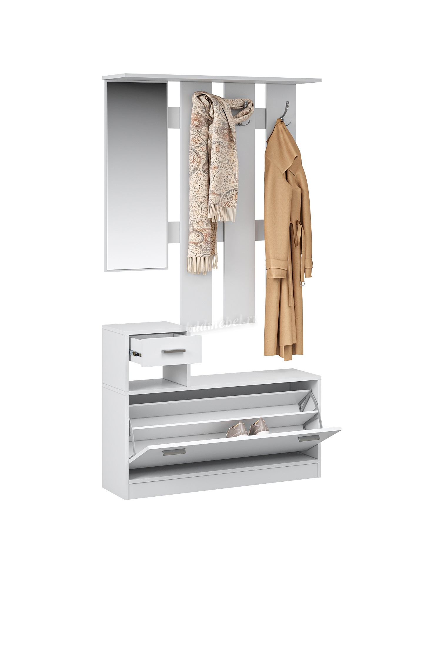 Интер – современная прихожая в стиле минимализм - минимум декора, максимум функционала. Компактная и вместительная, с небольшой глубиной – она поможет правильно организовать пространство в небольшом помещении. Прихожая включает в себя необходимые модули: вешалка с крючками, вместительные обувницы, выдвижные ящики для мелочей, зеркало.