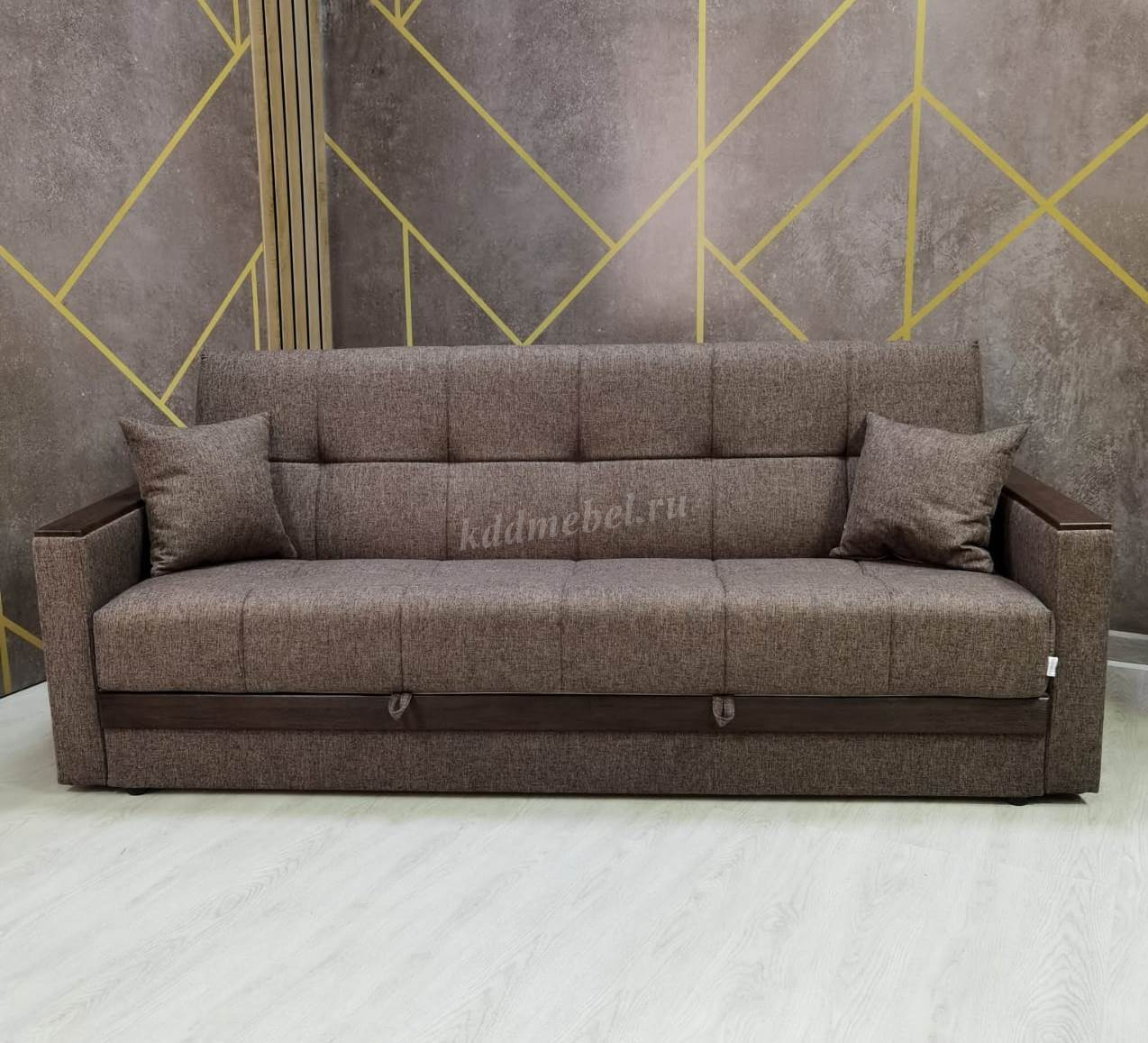 При трансформации требуется расстояние между диваном и стеной. Мебель является пристенной. Механизм «Книжка» прост и надежен в эксплуатации. Напольное покрытие в процессе раскладки не задействовано, Вы можете использовать пушистые ковры или дорогие паркеты. Емкость для хранения постельных принадлежностей с ламинированным основанием обеспечит Вам дополнительное пространство для хранения и сэкономит Ваше время при подготовке дивана ко сну. Ламинированное основание обеспечит простоту и удобство при уборке. Декоративные накладки из МДФ на подлокотниках и передней части короба, сочетают в себе представительность и элегантность, придают изящность дизайну