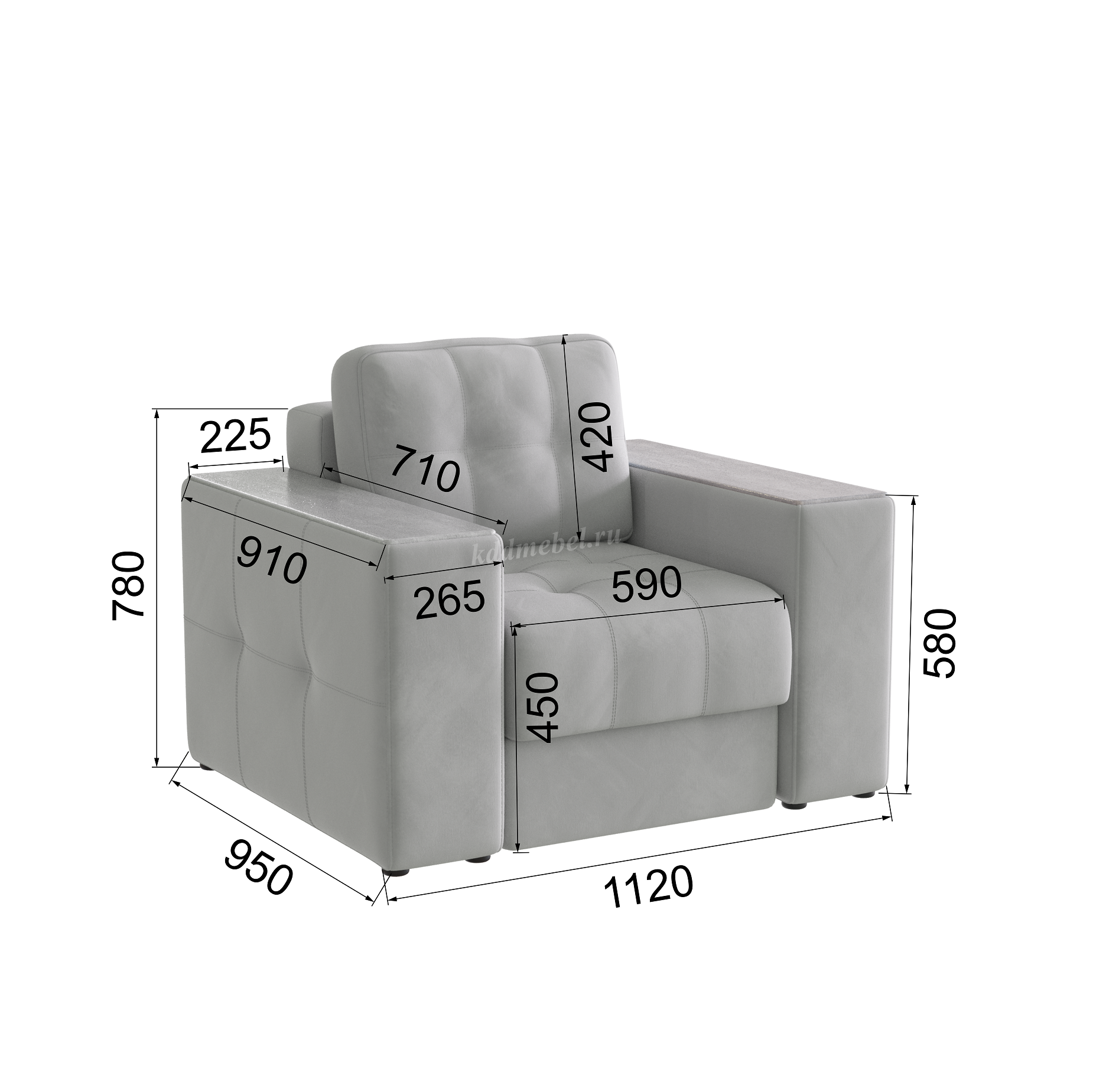 Подлокотники шириной 265 мм, обтянутые тканью и простеганные двойной отделочной декоративной строчкой.