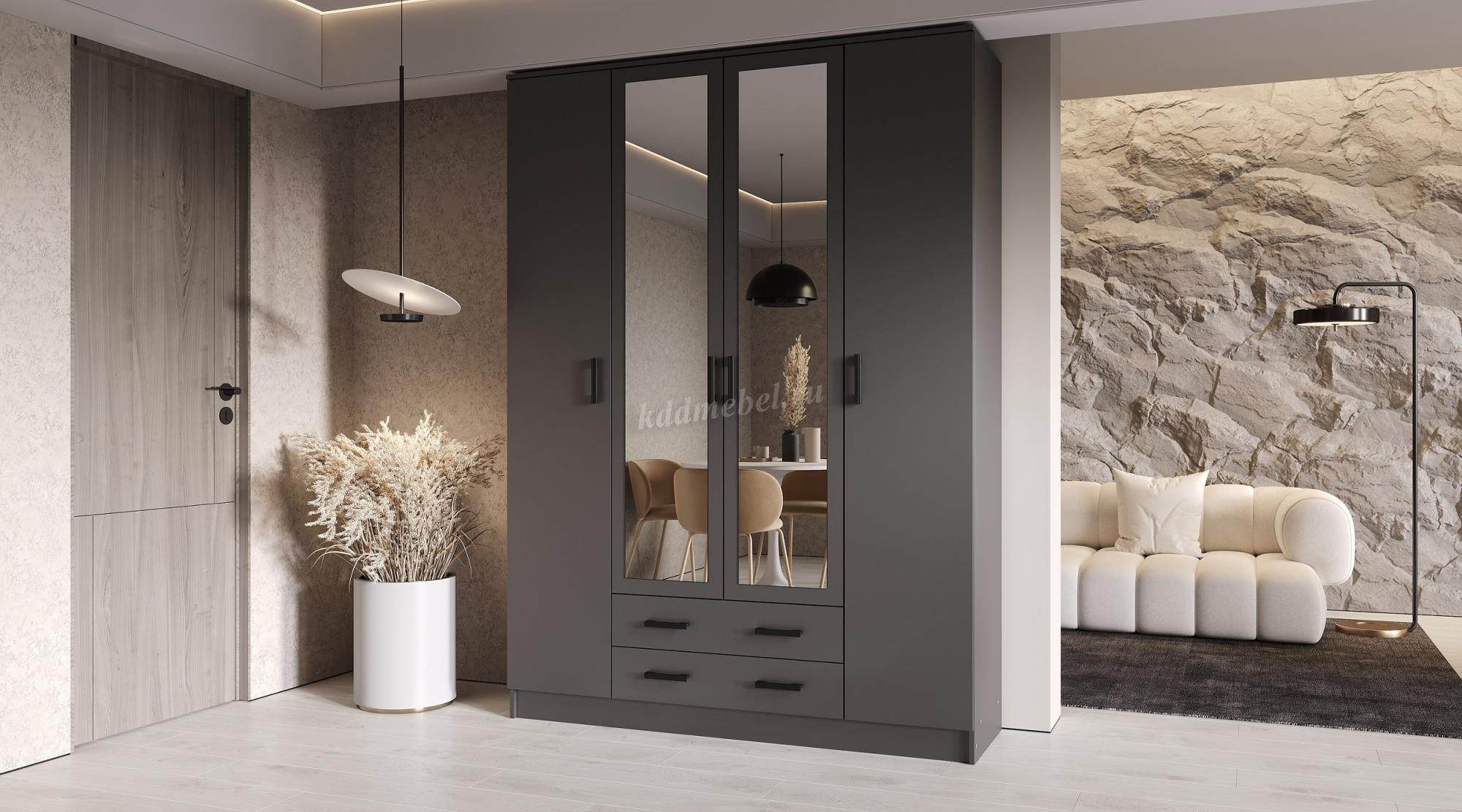 Помимо своей большой функциональности, четырехдверный шкаф Квадро отлично впишется в любое помещение Вашей квартиры либо дома, ведь у него в наличии 2 больших зеркала закрепленных на центральных дверях.